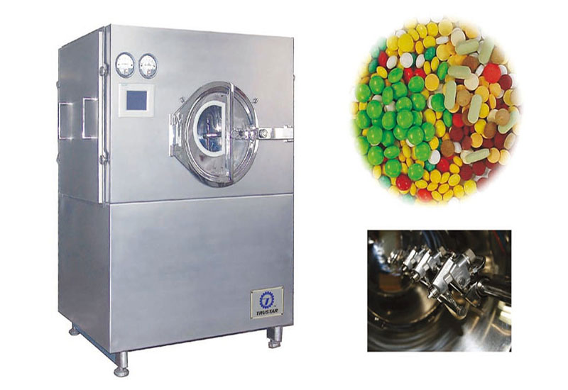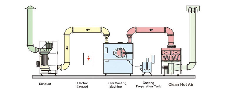 Los comprimidos deben recubrirse con una película en un movimiento orbital continuo dentro del tambor giratorio cerrado bajo la acción de una placa de guía aerodinámica. Durante el movimiento, la solución de recubrimiento se pulveriza automáticamente de acuerdo con el proceso artesanal y los parámetros artesanales racionales, al mismo tiempo, el aire caliente se suministra bajo un estado de presión negativa, el aire caliente pasa a través de las tabletas y sale de la parte inferior de las capas de las tabletas, lo hará hacer que la solución de recubrimiento rociada sobre la superficie de la tableta se seque rápida y uniformemente, formando así una película sólida y lisa sobre la superficie de la tableta.