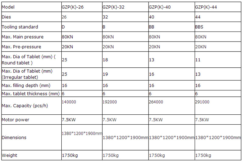 La máquina es un tipo de prensa rotativa de tabletas de un solo lado que puede presionar materiales granulares en tabletas de forma redonda, tabletas irregulares o tabletas grabadas por las dos caras. Esta máquina se utiliza principalmente en las industrias farmacéutica, química, alimentaria y electrónica.